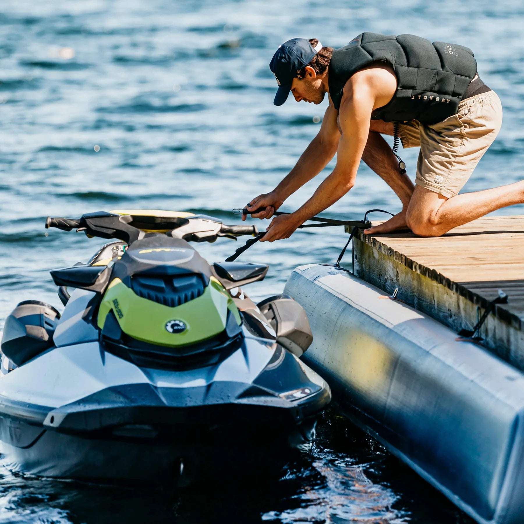 For optimal use, the tether lines should connect to a solid connection point on the PWC. Rear handles, lifting rings, and attachment loops built into the hull work best. The tether lines can also loop around the steering column for a secure attachment.